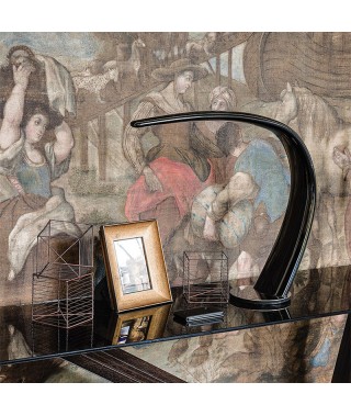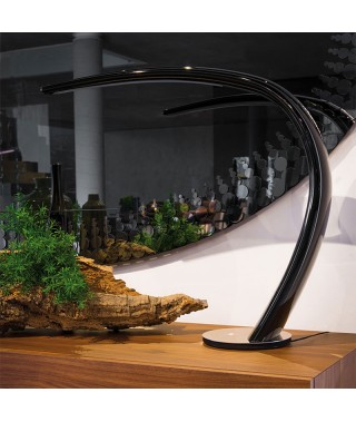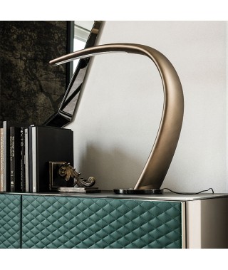 Lampada da tavolo in poliuretano rigido verniciato titanio (M11) o nero (L3) lucido con base in acciaio inox lucido oppure verniciato brushed bronze con base in cromo nero (06).