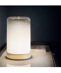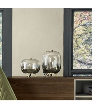 Lampada da tavolo con base in ottone naturale e vetro borosilicato.