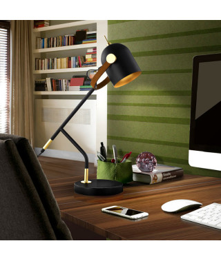 Lampada da tavolo a 1 luce, in metallo rifinito in nero opaco e oro con decorazioni in ottone lucido. Sostegno a “U” foderato in similpelle marrone.