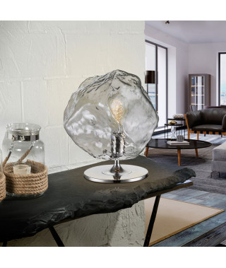 Lampada da tavolo a 1 luce, in metallo cromato. Grande paralume di vetro tonalità smoke chiaro.