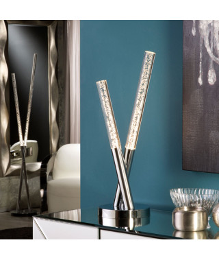 Lampada da tavolo a illuminazione LED in metallo cromato brillante formato da due sbarre, una parte delle quali in plexiglas con bolle d’aria interne. 10W LED. 1.040 lm. 3.000 K.