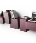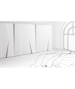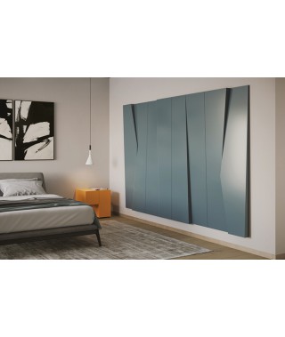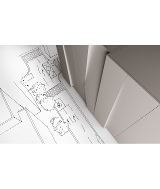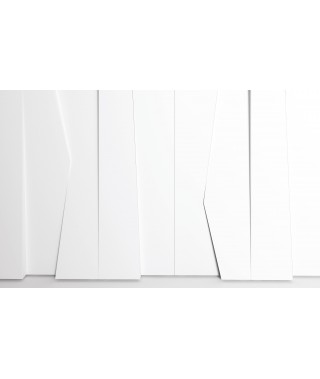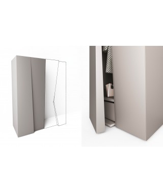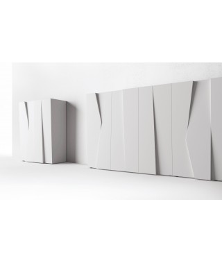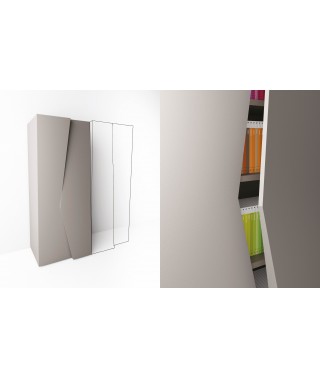 Contenitori in agglomerato di legno a due ante battenti scultoree, piedini altezza due cm regolabili. Finitura goffrata nei colori a campionario. Disponibile in versione armadio con tubo appendiabiti (profondita’ 63 cm) e versione contenitore a ripiani spostabili (profondita’ 47).