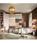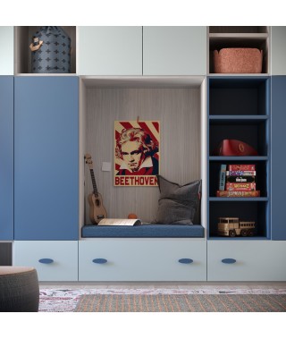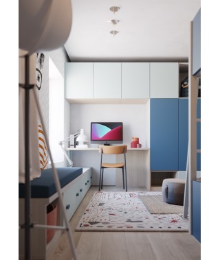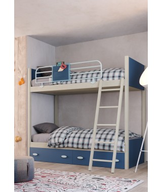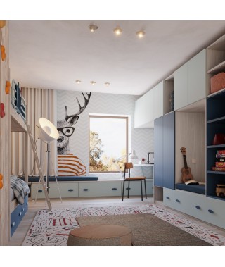 Giocosa, vivace, dinamica. Una cameretta con letto a castello, armadio battente con cassetti, scrivania e mobile basso.
