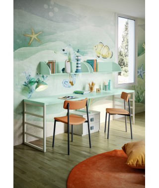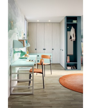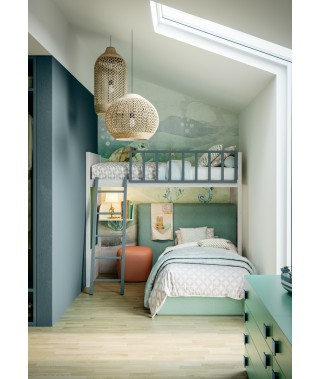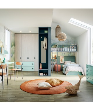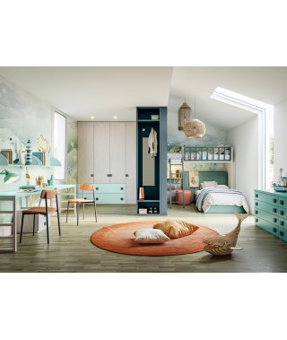 Uno spazio dove la fantasia non conosce limiti, con armadio battente, letto a castello, cassettiera e scrivania.