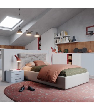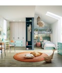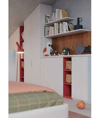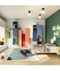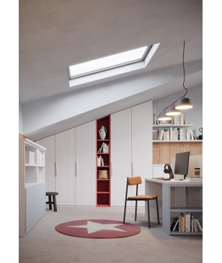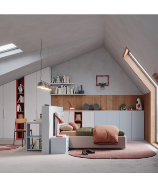 Colori vivaci interrompono la monotonia dei colori tenui in una cameretta per ragazzi, con armadio battente mansardato per sfruttare tutto lo spazio in altezza.