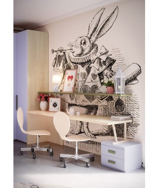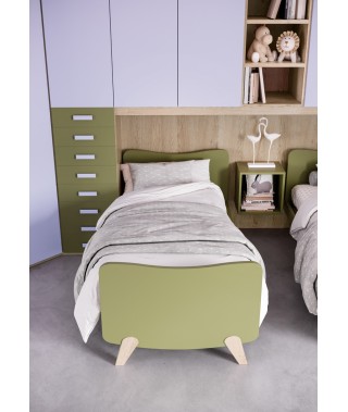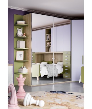Composizione moderna e colorata: l’armadio battente con cabina ad angolo si unisce a quello con anta scorrevole e libreria.