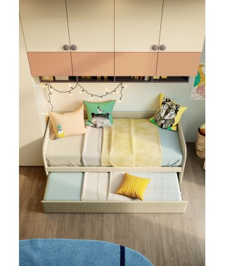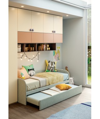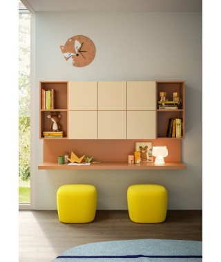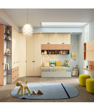 Il piacere di crescere in una cameretta con armadio battente con cabina ad angolo, scrivania sospesa e divano imbottito.