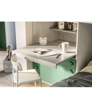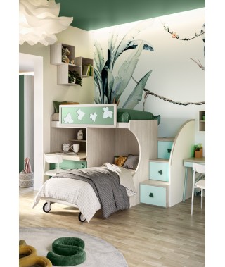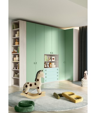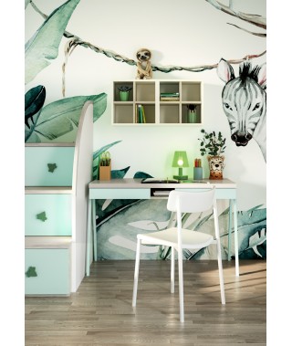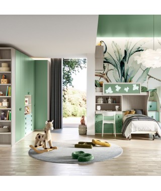 Cameretta che richiama la vivacità della natura con armadio battente, letto a soppalco e scrivania.