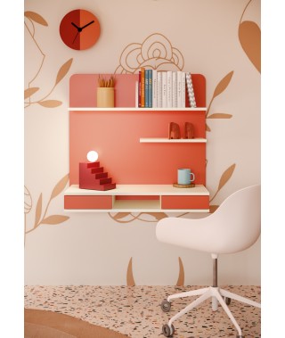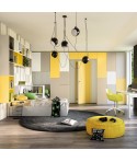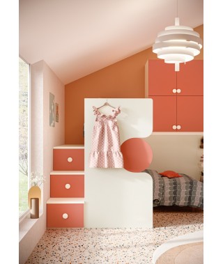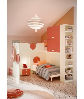 Il soppalco ad angolo è la chiave di successo di questa cameretta dai toni che richiamano la primavera.