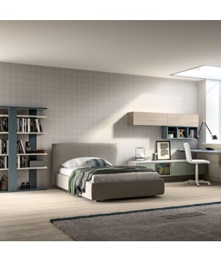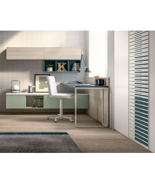 La scrivania è affiancata da comodi pensili in Frassino e cubotti colorati. I pensili colorati Salvia hanno vani a vista.