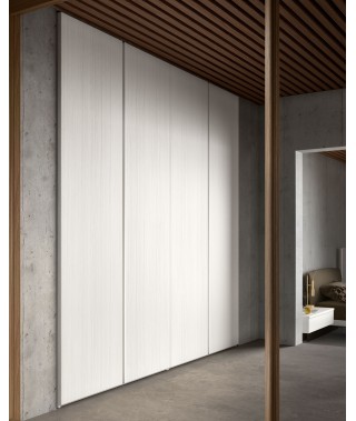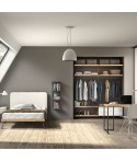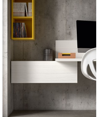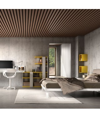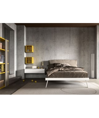 Il giroletto “Tetris” è nella versione con piedini inclinati. Il comodino sospeso in Larice Sbiancato è abbinato ai cubotti colorati che aiutano a decorare con allegria la parete.