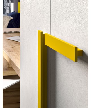 Le maniglie sono segni grafici che decorano l’anta con tocchi di colori caldi e vibranti.