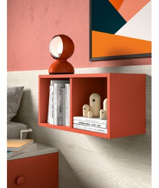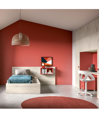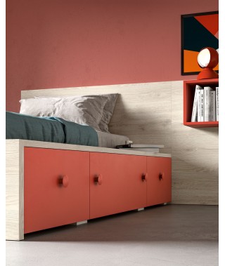 La testiera-boiserie ospita i pensili cubotti, comodini che aiutano ad arredare la stanza con allegria e personalità.