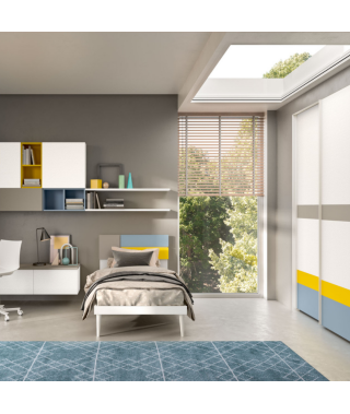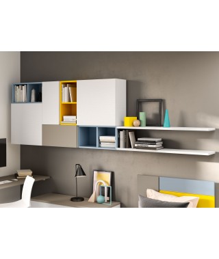 Focus sulla composizione articolata dei pensili che alternano contenitori chiusi a cubotti a vista colorati che riprendono le nuance della testiera e dell’armadio.