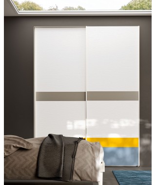 La testiera “Fusion” ha tre pannelli che si possono personalizzare abbinando le proprie nuance preferite, la stessa cosa vale per le fasce dell’armadio “Stripe”.