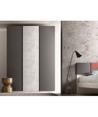L’ armadio mostra nell’anta centrale la nuovissima finitura Graphic, messa in risalto dalle altre due ante in Grafite.