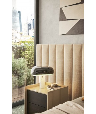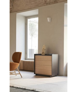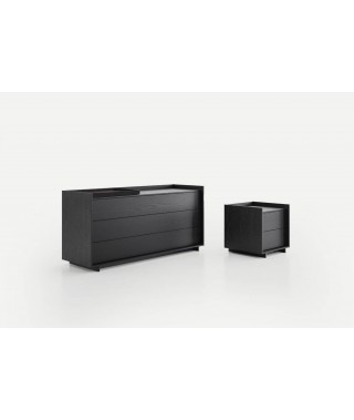L’essenziale non è mai superfluo. I complementi del gruppo notte Kyoto – comodino e comò – nascono dalla ricerca del tratto assoluto tra angolo e linea retta, in una composizione misurata di superfici.