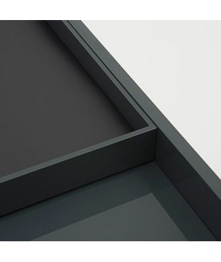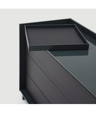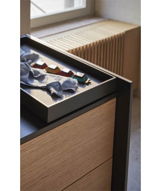 Il top si trasforma in una nicchia aperta, una superficie di appoggio discreta ed elegante, dove è possibile posizionare un ulteriore complemento: un vassoio con il fondo imbottito in pelle sintetica, perfettamente inserito nel profilo del piano, in cui riporre oggetti personali e preziosi.
