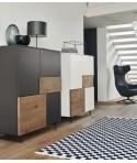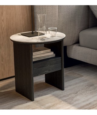 Comodino Tau, con struttura e cassetto in impiallacciature smoke, top in ceramica marmo silk white.