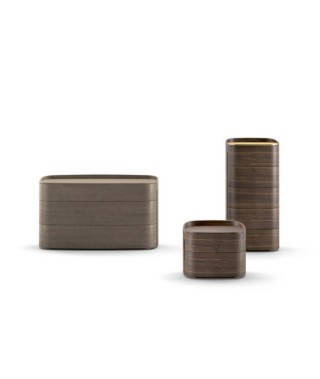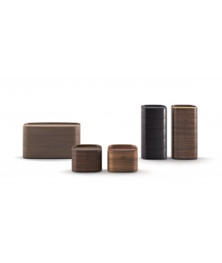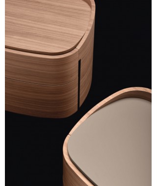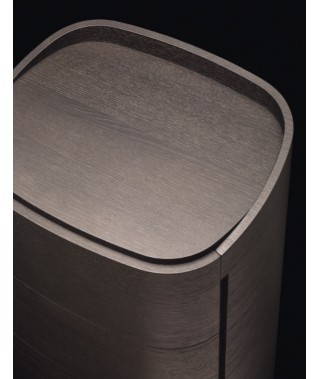 I contenitori Babila sono contraddistinti dalle forme arrotondate e dal profilo superiore a salire rispetto al top, il quale a sua volta mette in evidenza il suo spessore, sporgendo rispetto al bordo del cassetto superiore. Il taglio verticale per l’apertura cassetti è un altro segno distintivo di questo progetto. L’impiallacciatura in legno avvolge completamente il mobile, abbracciandolo senza soluzione di continuità.