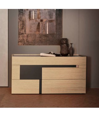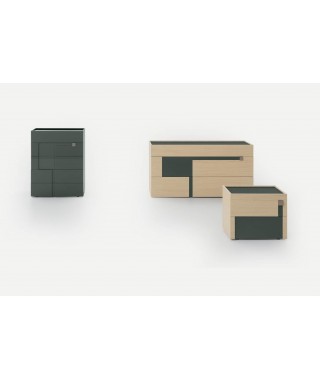 Giochi di incastri e di geometrie, dinamismo e colore. Un omaggio a Bruno Munari e ai suoi studi sugli effetti spaziali derivanti dall’accostamento di piani colorati. La parte frontale dei moduli di questa famiglia di contenitori si caratterizza per la presenza di elementi sfalsati e sovrapposti in dialogo tra loro. Il contrasto di colori e volumi tra la superficie esterna e quella interna crea composizioni estetiche differenti, vibranti e dinamiche. La particolare geometria delle superfici permette inoltre l’apertura del cassetto, rendendo il segno grafico anche funzionale.