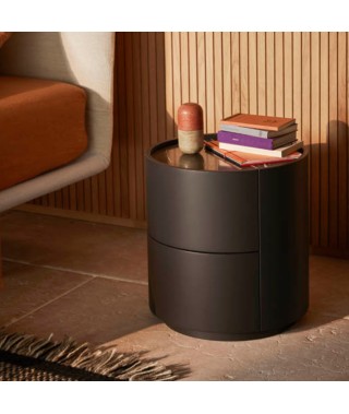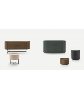 Affascinante, sensuale e camaleontica. Una collezione con molteplici possibilità di utilizzo, di personalizzazione e di interpretazione dello spazio, che si declina a partire dall’essenzialità geometrica della forma cilindrica. Caratteristico il pratico incavo sulla sommità dei volumi, pensato come funzionale e versatile vassoio contenitivo. Disponibile in molteplici finiture e abbinamenti, la collezione comprende comodini con cassetto singolo o doppio, sovrapponibili o con basamento, e la versione comò, disponibile sia con basamento sia con zoccolo.
