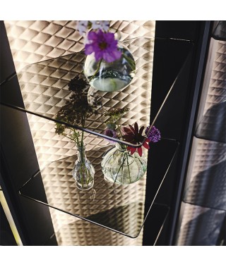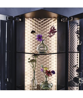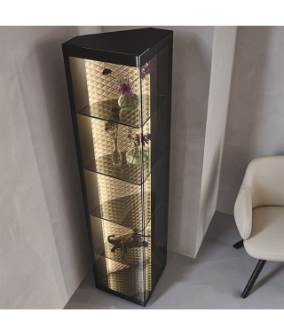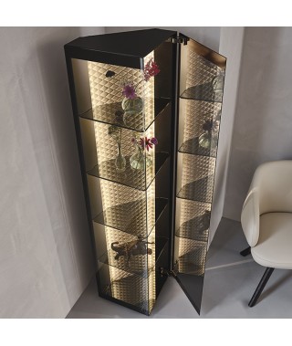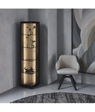 Vetrina con struttura e piedi in acciaio verniciato goffrato nero (GFM73), ante e fianchi in cristallo fumè con fasce in cristallo verniciato nero.