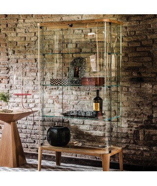 Ripiani in cristallo extrachiaro trasparente. Con luce a led. Portata massima ripiani: kg 6 cad.