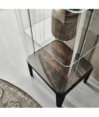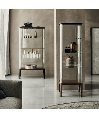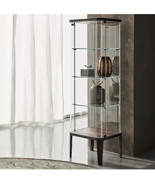 Vetrina in cristallo extrachiaro trasparente con cielo e fondo in noce Canaletto (NC) o rovere bruciato (RB).