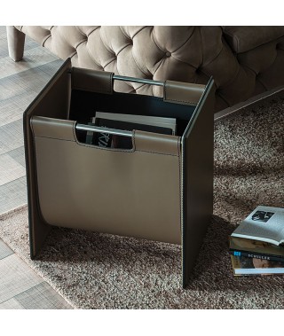Porta riviste con telaio in acciaio cromato (08) rivestito in cuoio come da campionario. Cuciture standard.