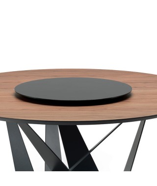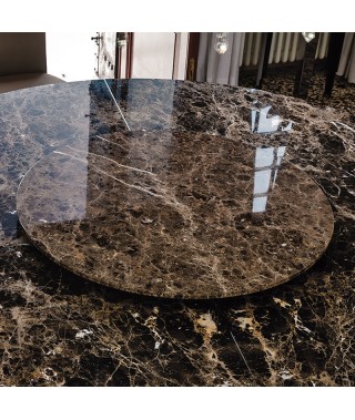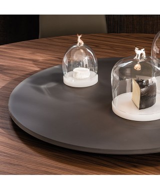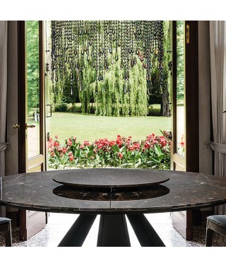 Vassoio centrotavola girevole in cristallo extrachiaro acidato verniciato bianco, nero o graphite, in ceramica Marmi nei colori Alabastro (KM02), Ardesia (KM04), Emperador (KM10) o Makalu (KM11), in marmo bianco Carrara (BC) o Emperador (EMP).