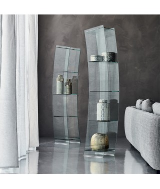 Vetrina a giorno in cristallo trasparente e particolari in acciaio inox lucido. Portata massima ripiani: kg 7 cad.