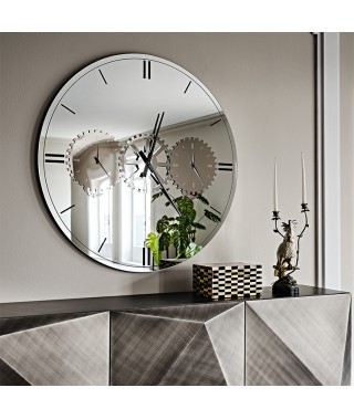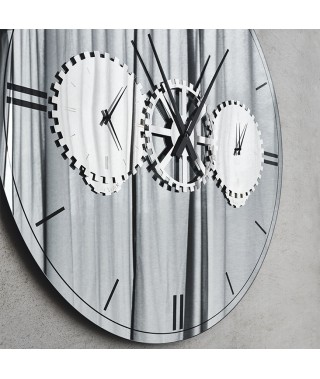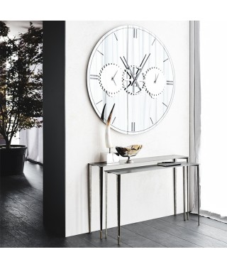 Il fascino di uno specchio si unisce alla praticità di un orologio a parete moderno. L'orologio specchiato Times è un accessorio di design decorativo e allo stesso tempo funzionale. E' infatti composto da tre quadranti da posizionare su fusi orari differenti. Il quadrante di sinistra è regolabile su New York, Londra o Roma, mentre il quadrante di destra su Mosca, Tokyo o Sydney. Le città sono incise sullo specchio rotante sottostante, e ciascuno ha la libertà di decidere su quale coppia di città sintonizzarsi. Il risultato è un orologio a parete di design incisivo e prezioso, che ti invita a viaggiare con la fantasia.