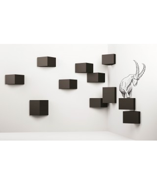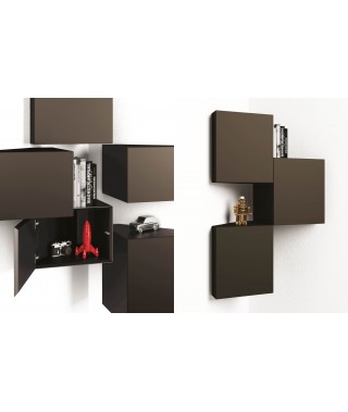 Contenitore pensile pentagonale, ideato per composizioni multiple e angolari, in agglomerato di legno con anta battente.