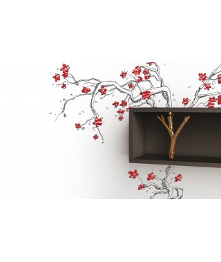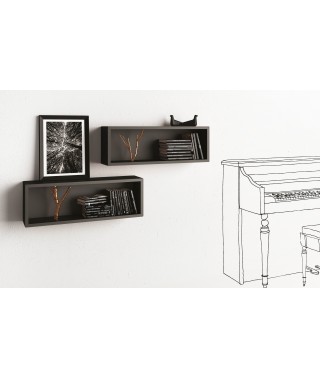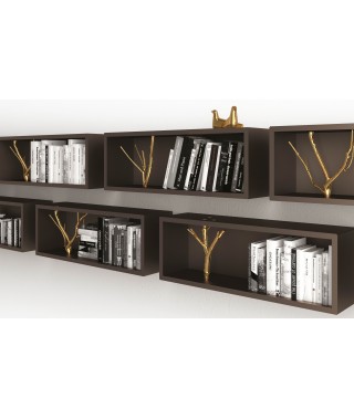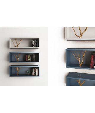 Mensola / contenitore a giorno in agglomerato di legno, disponibile in legno teak laccato opaco o in finitura goffrata nei colori a campionario, inserto ramificato in fusione di ottone.