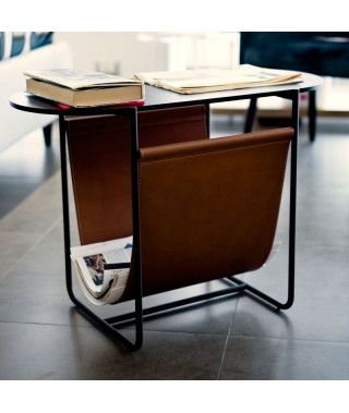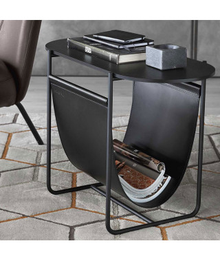 L’essenziale, ma al contempo elegante, struttura di metallo combinata con il top ellittico, in diversi materiali, e il portariviste, conferiscono a questo complemento un aspetto sofisticato e discreto.