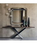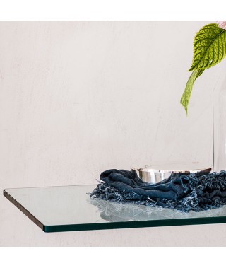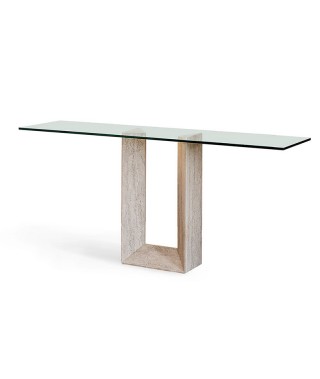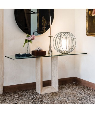 Consolle con base in Travertino (TN) o bianco Carrara (BC) e piano in cristallo trasparente 12mm. Piano in appoggio.