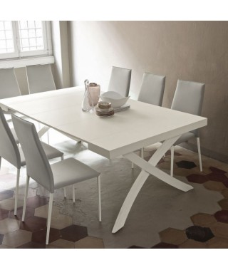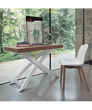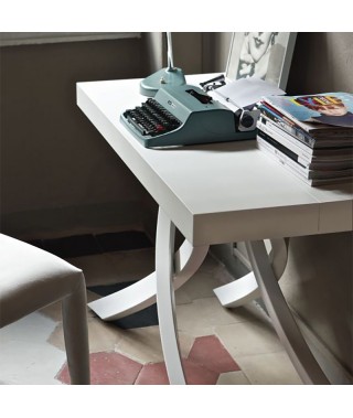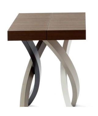 Tavolo consolle con struttura in Acciaio laccato. Piano e prolunghe in Legno laccato e Legno impiallacciato.