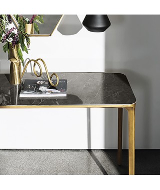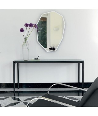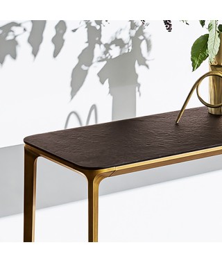 Console con gambe in alluminio pressofuso cromato o verniciato, varie finiture, e struttura con profilo in alluminio anodizzato o verniciato, varie finiture. Piano in vetro temperato sp. 8 mm laccato o acidato laccato, vari colori.