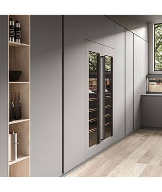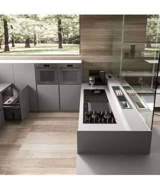 Le ante sono composte principalmente da un telaio brevettato in alluminio estruso, leggero, solido e con spessori ridotti, capace di aumentare il valore della cucina abbinato ai frontali di spessore 4 e 6 mm. disponibili in numerose finiture estetiche: