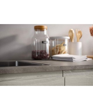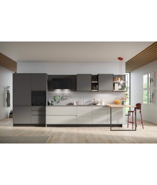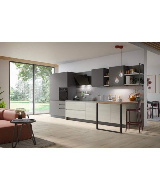Un’elegante cucina dal design minimal in 4,50 m: Fly 04 di Prima Cucine è una idea di composizione per te se vuoi una cucina lineare compreso il piano snack in un open space contenuto. La composizione è resa dinamica dal corpo operativo sporgente delle basi in laminato frassino Livigno con top in laminato stained metal. Creano così anche un contrasto colore rispetto alle colonne e ai pensili in PET pepe.