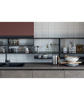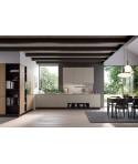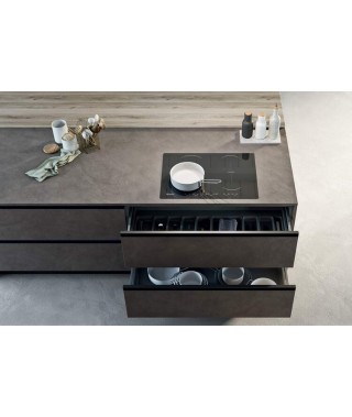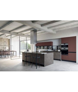 Il gusto moderno di questa cucina a isola Hera si fonda sull’anta liscia con maniglia in metallo integrata, che è anche una scelta pratica. Agevola infatti l’apertura e la pulizia. Il carattere dell’insieme si esprime con i colori a contrasto: il deciso marsala di colonne e pensili e il neutro resina bronzo di basi e top.