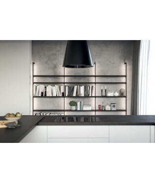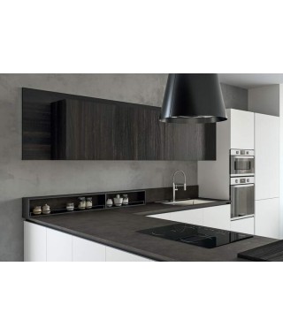 Sei di fronte a una scelta estetica sicura: la pulizia del bianco, riscaldata dal legno, evidenziata dal contrasto con la finitura piombo di sgabelli, zoccoli dei mobili e gole d’apertura. Ha poi aspetti pratici, primo fra tutti il laccato UV super matt di basi e colonne.