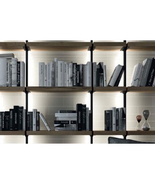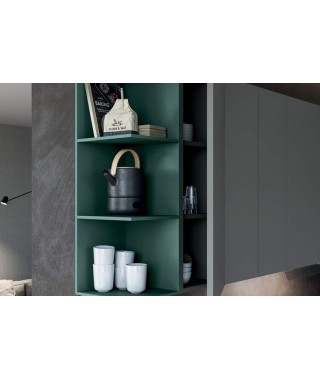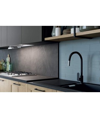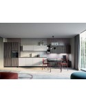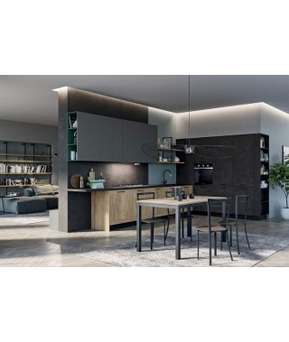 Utilizza entrambe le tipologie di ante Domino! Qui usiamo l’anta liscia per le colonne in resina lava e per i pensili in grafite matt, mentre per le basi in rovere vintage abbiamo l’anta a telaio. Il materiale di tutte le finiture, riprese poi nei mobili del salotto, è melaminico poro aperto opaco.