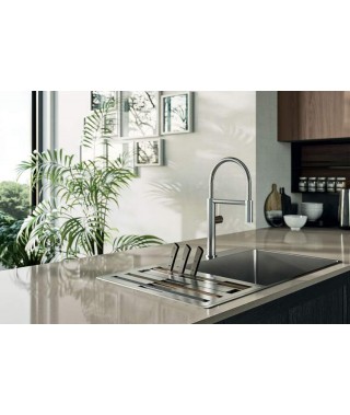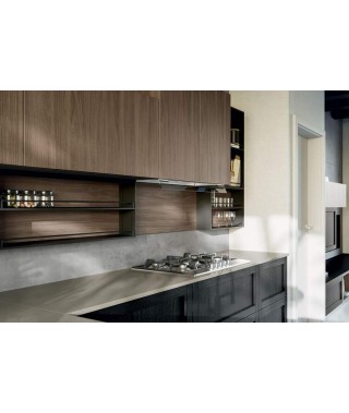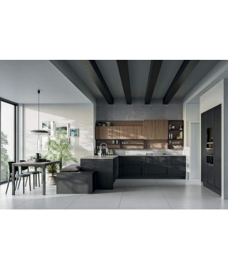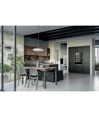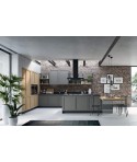 Se hai uno spazio cucina di 35 metri quadri almeno, prendi spunto da questa cucina attrezzata con penisola Noah. L’ambiente si articola in dispensa in colonne separate, preparazione, pranzo e living, uniti da toni in stile industriale: l'ardesia opaco di basi e colonne in laccato e il quarzo creta del piano di lavoro.