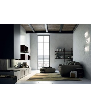 In questa cucina lineare Noah, le ante a telaio in stile industrial con la presa integrata, che ne agevola l’apertura, sono rese più classiche dall’aggiunta delle maniglie. Il sapore industriale è sostenuto dall’abbinata legno e metallo della libreria Graphic, delle sedie Sammy con seduta laccata in tinta e del tavolo Step.