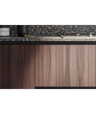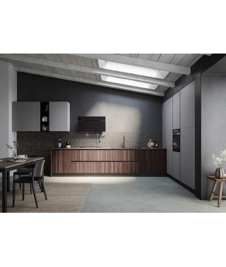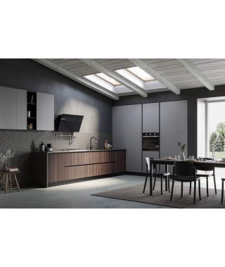 Composta infatti dal blocco dedicato a dispensa ed elettrodomestici delle colonne incassate, dall’area operativa lungo le basi, delimitata dal piano di lavoro che la abbraccia anche sul fianco esterno, e infine dal pensile che offre uno spazio aggiuntivo per riporre e un vano a giorno per oggetti e alimenti di uso frequente.