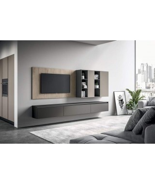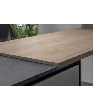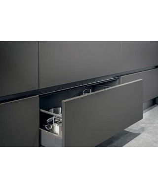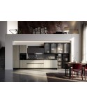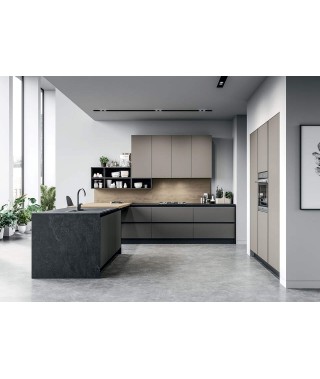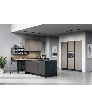 È una cucina moderna funzionale, Tris. È strutturata su tre diverse aree per agevolare i flussi di lavoro. C’è quella dispensa con frigorifero e forno incassati nelle colonne, c’è la zona lavaggio nell’isola e quella cottura a parte, servita da pensili e vani a giorno. Pensili e colonne sono in melaminico castoro opaco, basi in melaminico grafite opaco, top e fianchi in laminato carbomine.