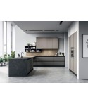 Questa cucina ad angolo dal gusto minimal Zoe è una finta cucina a “L”, in realtà, perché l'area colonne e quella lavaggio e cottura sono di fatto separate. Fanno da unione un elemento a giorno, pratico per ottenere ulteriore spazio per riporre, e lo schienale in laminato, usato anche per il piano di lavoro e per i fianchi delle basi.