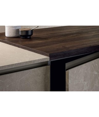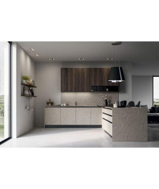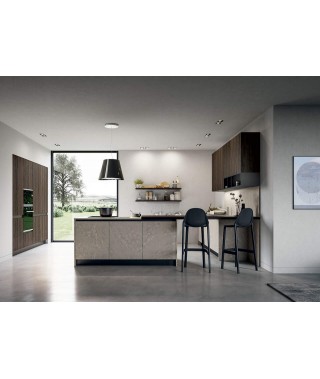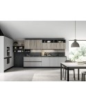Cucina ricercata in melaminico Zoe. Possibile? Certo! Il melaminico assicura una cucina duratura e a prezzo conveniente, lo stile Prima Cucine la rende moderna, di tendenza e ricercata. La composizione è molto strutturata con colonne a sé stanti, basi e pensili a parete, isola centrale unita da un piano snack all’area lavaggio.